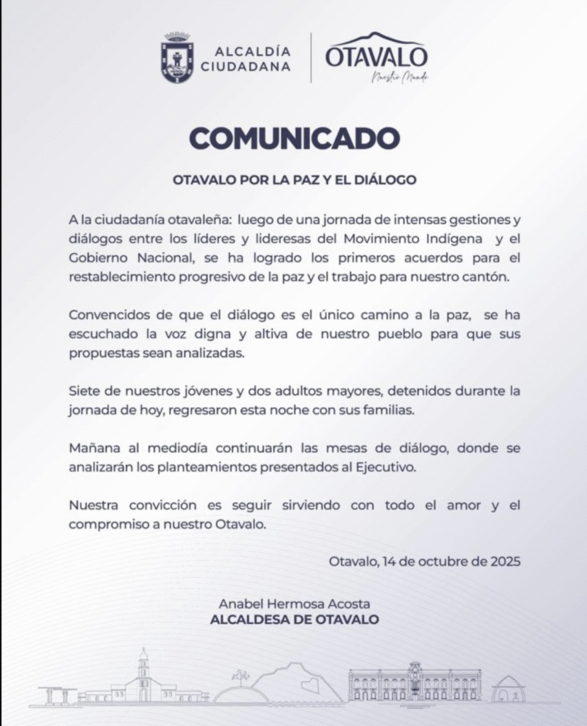 Otavalo, 15 de octubre de 2025 – La alcaldesa de Otavalo, Anabel Hermosa Acosta, anunció importantes avances en el proceso de diálogo entre representantes del movimiento indígena y el Gobierno Nacional.