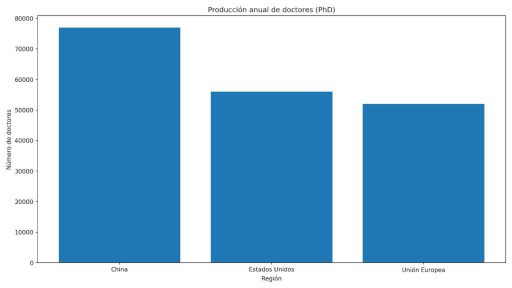 • Programas de doctorado masivos, con China liderando el número anual de nuevos doctores en ciencias e ingeniería.