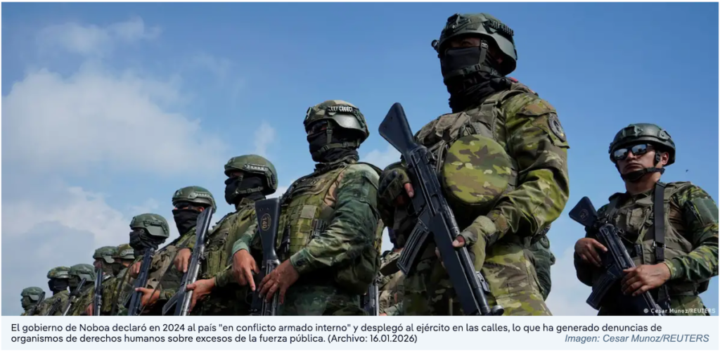 Noboa declaró en 2024 a Ecuador en conflicto armado interno para desplegar a las calles a los militares, lo que ha generado denuncias de organismos de derechos humanos sobre excesos de la fuerza pública.
