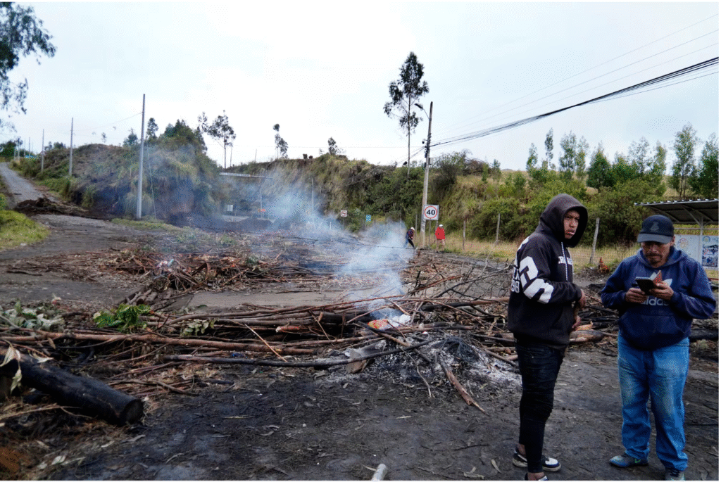 -Guaranda – vía a Riobamba por Gallo Rumi, sector Vinchoa Grande – Las Herrería, cerrada por manifestantes, tierra en la vía, quema de llantas.