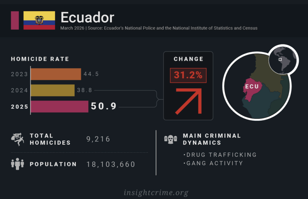 A contracorriente de la tendencia regional, Ecuador registró un aumento del 31,2% en su tasa de homicidios, alcanzando un histórico de 50,9 asesinatos por cada 100.000 habitantes en 2025.
