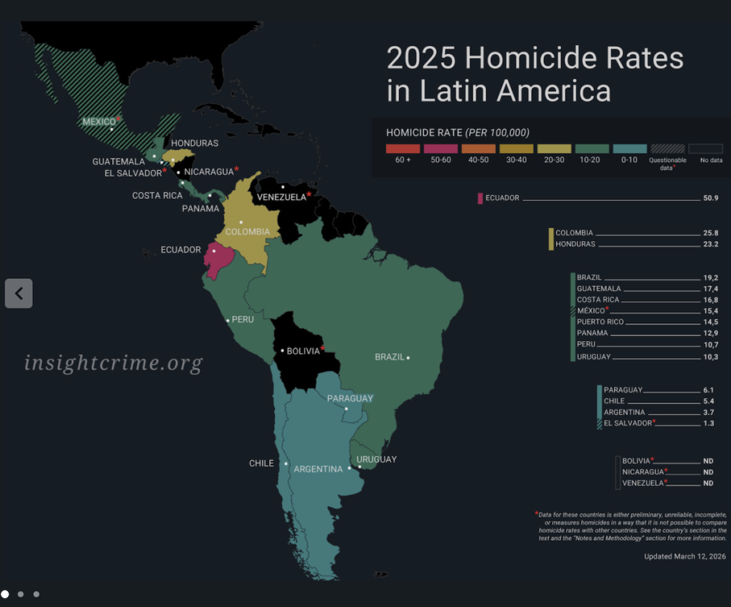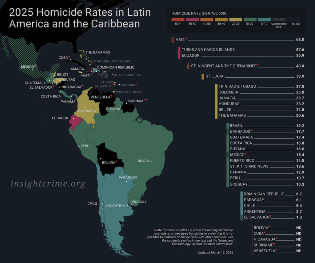 De acuerdo con el informe InSight Crime’s 2025 Homicide Round-Up, al menos 108.838 personas fueron asesinadas en América Latina y el Caribe durante 2025, lo que representa una tasa promedio de 17,6 homicidios por cada 100.000 habitantes.