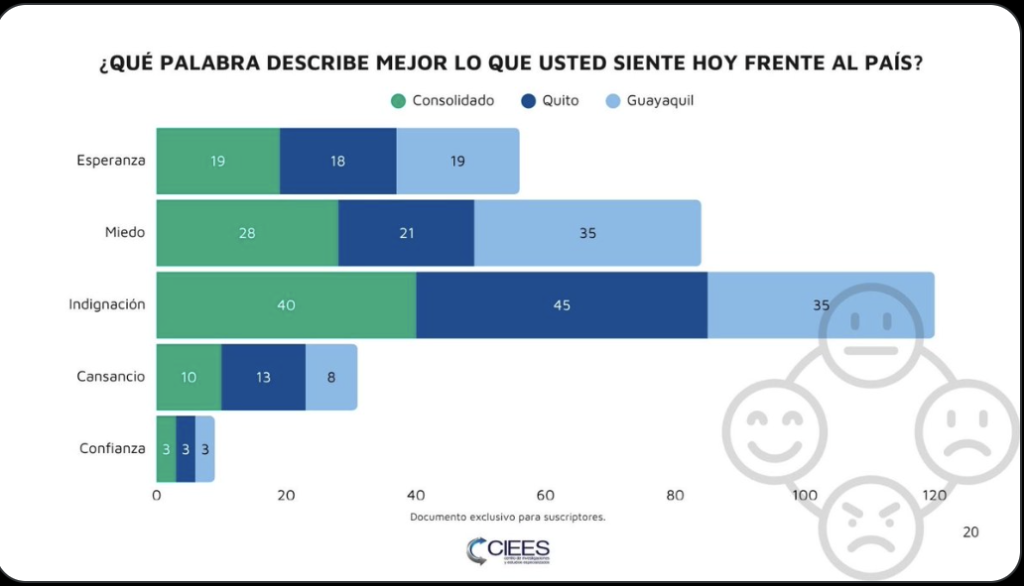 Un reciente análisis de la firma CIEES revela un deterioro sostenido en el clima emocional y político del país. Entre febrero y abril de 2026, aumentan la indignación y el miedo, mientras la confianza en el presidente Daniel Noboa cae a niveles mínimos.