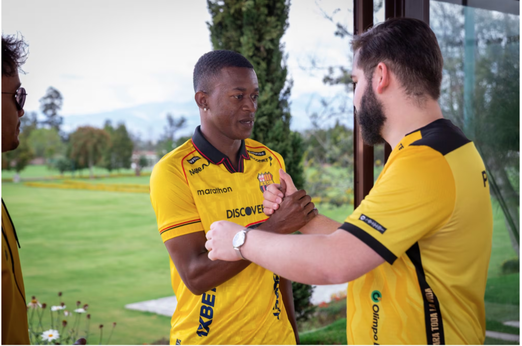 Jordan Medina (c), nuevo refuerzo de Barcelona SC, saluda con David Álvarez, presidente de la Comisión de Fútbol. Foto: Tomada cuenta en X Barcelona SC