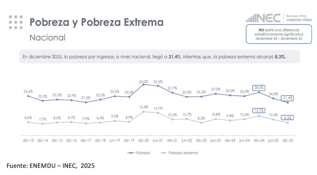 El truco: Estos bonos llegaron justo cuando el Instituto de Estadística (INEC) estaba haciendo la encuesta de hogares (ENEMDU) que mide la pobreza. Entonces, muchas familias reportaron un «ingreso» temporal más alto gracias al bono. Pero ese dinero no es sostenible, no crea empleo y no resuelve el problema de fondo. Es como dar un paracetamol para una fractura expuesta: alivia el dolor un momento, pero no cura el hueso roto. El bono se gasta, la pastilla se disuelve y la familia vuelve a la misma situación precaria, el dolor empeora, pero en el papel ya «salió de la pobreza».