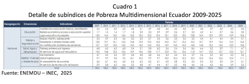 Trabajo y Seguridad: Aquí está el corazón del problema. El indicador de «no afiliación a sistema de pensiones» (IESS) creció, mostrando que cada vez más gente trabaja en la informalidad, sin futuro ni jubilación, el 54% de la PEA trabaja en la informalidad. El empleo inadecuado o desempleo subió al 16%. Esto significa que la pobreza en Ecuador es, sobre todo porque no hay empleo adecuado: trabajos mal pagados, inestables y sin derechos.