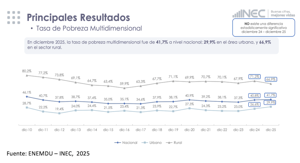 Inmediatamente, este dato fue presentado como la prueba máxima de que su gestión genera resultados espectaculares para los más pobres. Se armó una campaña mediática en torno a este «milagro económico». Pero hay un problema enorme: es un espejismo, un truco estadístico. Este «milagro» no refleja una mejora real en la vida de la gente. Por el contrario, sirve para tapar una realidad muchísimo más dura: la pobreza multidimensional. La cual mide carencias como falta de agua potable, el hacinamiento, empleo precario, la deserción escolar y la educación truncada. Esta medida de la pobreza estructural se mantuvo congelada en el 41.7% a nivel nacional. Y en el campo, la situación es catastrófica: el 66.9% ecuatorianos que viven en la ruralidad es objetivamente pobre. Esto significa que dos de cada tres personas en el campo no tienen acceso a lo más básico para una vida digna.