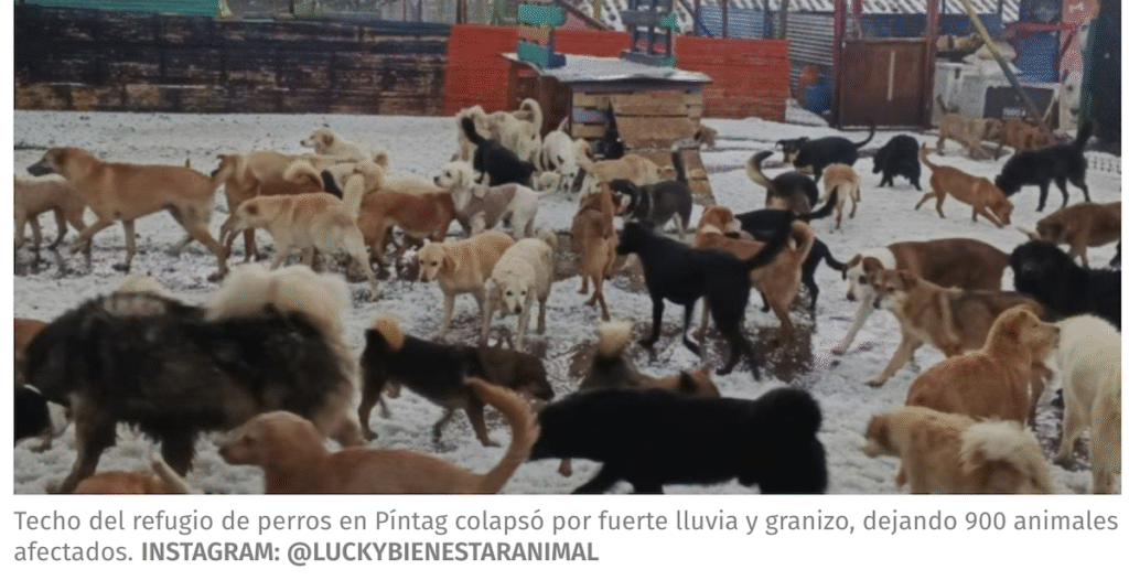 Requieren ayuda urgente. Una intensa granizada la tarde del jueves 20 de noviembre de 2025 provocó el colapso del techo del refugio de perros rescatados Fundación Lucky, dejando a 900 animales empapados y sin un lugar seguro donde refugiarse.