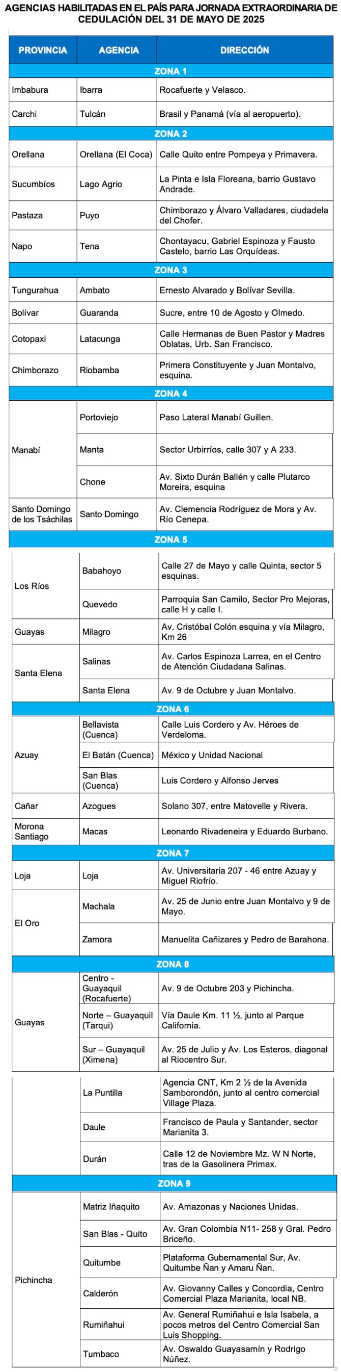 El Registro Civil del Ecuador abrirá una jornada extraordinaria de cedulación este sábado, 31 de mayo, en horario de 08:00 a 14:00, en 39 agencias del país.