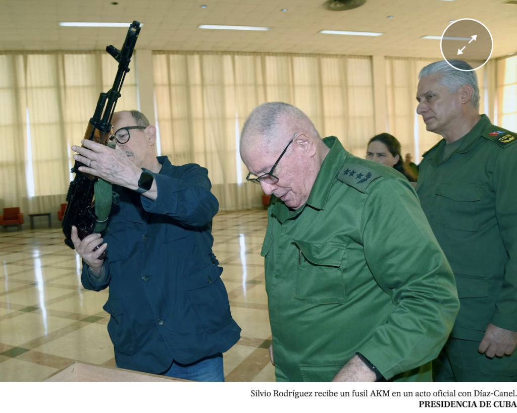 Este viernes ese comentario escaló hasta lo más alto de las Fuerzas Armadas, cuyo ministro, Álvaro López Miera, entregó al célebre trovador un fusil “en justo reconocimiento a su patriótica disposición de empuñar las armas para defender la Patria ante cualquier agresión del Gobierno de Estados Unidos”.
