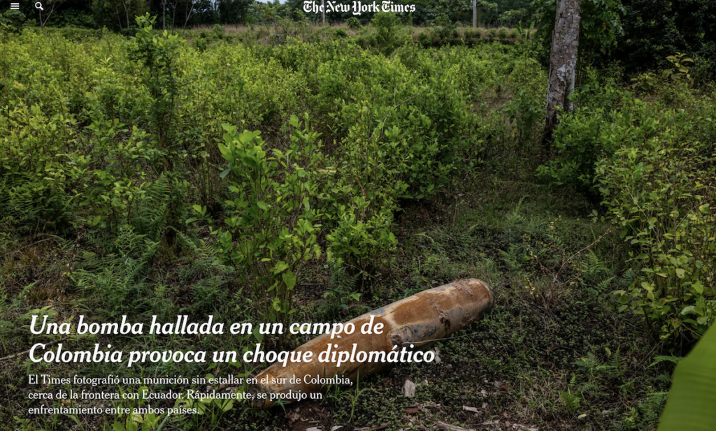 Un equipo de periodistas de The New York Times que se encontraba en la frontera entre Ecuador y Colombia la semana pasada se enteró por medio de campesinos locales de un hecho alarmante: nos contaron que habían encontrado una gran bomba sin explotar en un campo de cultivo.